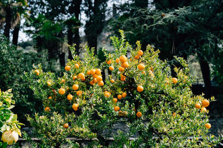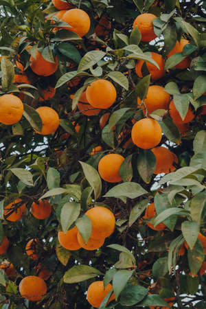 Many oranges on decorative orange trees on a street in Seville, Andalusia, Spain.