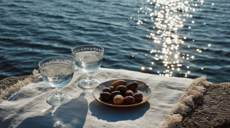 Two glasses of wine accompany a plate of olives on linen, illuminated by the warm ocean sunlight and reflecting water.