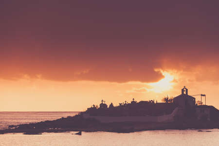 Agios Fokas near Monemvasia in stormy weather overcast sky, sunrise. Small cemetery on sea shore, Maleas peninsula region Peloponnese