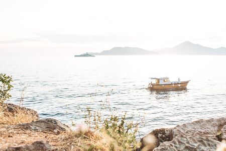 View of the natural landscape in Montenegro. View of the sea on which the boat floats.