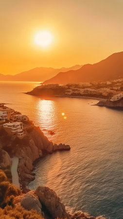 Generative AI : Aerial view of Marbella a small city along the Mediterranean Sea coastline at sunset Malaga province Andalusia Spain