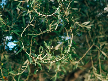 Olive branch with leaves close-up. Olive groves and gardens in Montenegro.