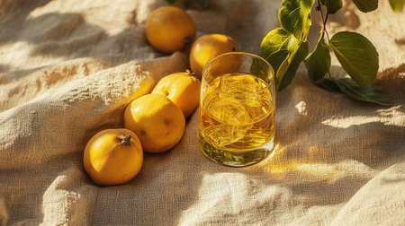 A close-up of a glass filled with golden quince alcohol, sitting on a textured canvas fabric, with fresh quince fruits arranged nearby, highlighting the drinkaes natural origins