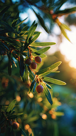 The Juniper berry at dawn, soft golden sunlight kissing leaves, clean air, natural color tone.