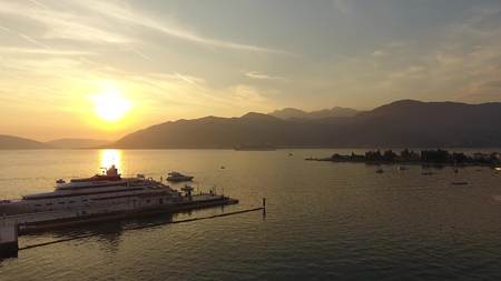 Yachts moored in the bay in the rays of the sunset. Montenegro, Tivat