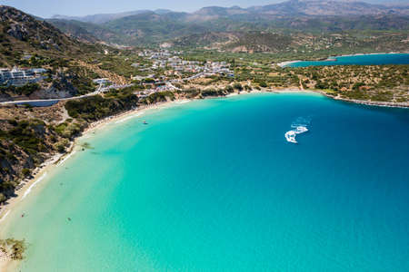 Aerial view of the beautiful sandy beach and crystal clear waters of Voulisma Beach, Crete, Greece