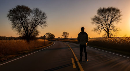 A rear view of a man standing in the middle of a paved road, gazing at a golden sunset over a rural landscape with silhouetted trees. The scene creates a sense of wanderlust, decision-making, and peaceful solitude.
