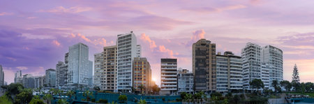 Modern urban landscape at sunset with modern high-rise buildings in the upscale Miraflores district of Lima, Peru.