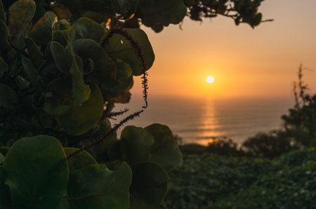 Scenic view of unfocused sunset in Costa Verde of Miraflores in Lima Peru, natural leaves frame