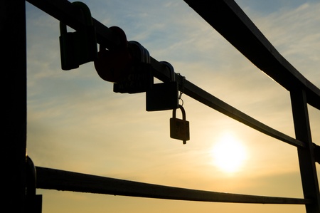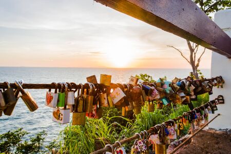 A shot of Love Key Ceremony on a rail with a scene of sunset at the sea as a background in Thailand.