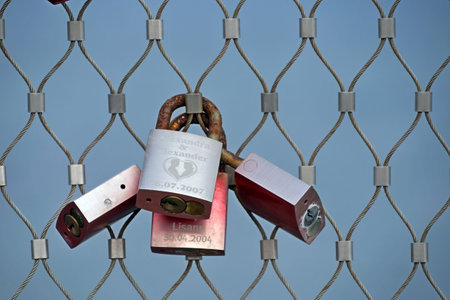 Rusty love locks hanging on the fence as a symbol of loyalty and eternal love