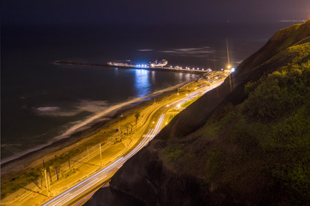 Night view of the ravines and streets against the Pacific Ocean, seen from the Miraflores area, Lima, Peru
