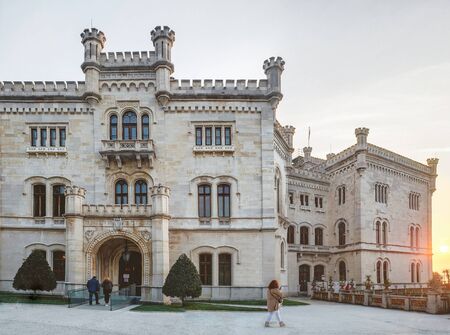Facade of Miramare castle in Trieste, Italy, at sunset