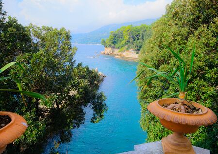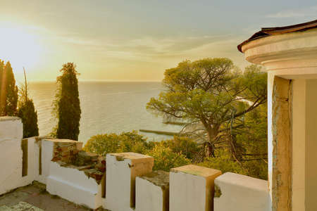 White balustrade surrounded by trees on the background of the blue sea.