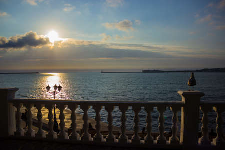 Beautiful sunset on the promenade of the city of Sevastopol. Sea with sun glare, backlit clouds and a seagull on the railing