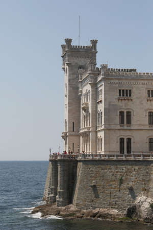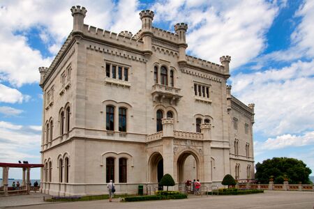 TRIESTE, ITALY - JULY 23: View on the historic Castello Miramare as visitors pass by on July 23, 2017 in Trieste, Italy.