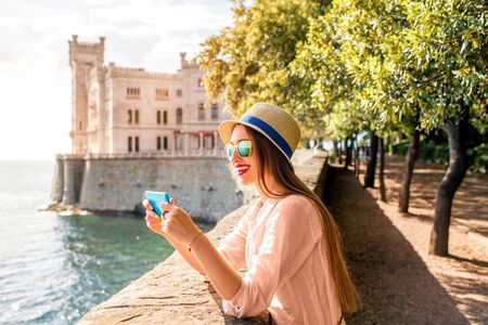 Young woman having fun photographing landscape near Miramare castle in northeastern Italy. Traveling in Italy