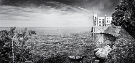 Miramare castle near Trieste, northeastern Italy. Travel destination. Beautiful architecture. Panoramic photo. Black and white photo.