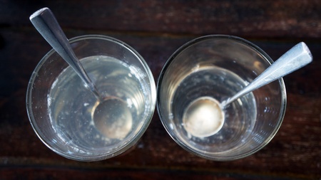 A glass of chicken broth on small wooden table with lovely morning shadows.