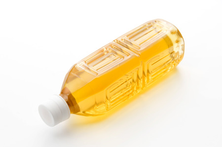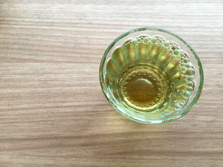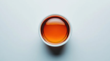 A top view of a round cup filled with amber liquid showcases the simplicity and elegance of a warm beverage against a white background. Ideal for food and drink themes.