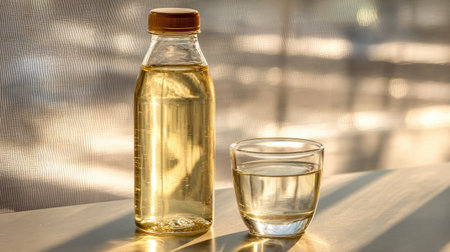 This image features a clear bottle filled with liquid and a glass placed beside it, illuminated by soft sunlight, creating a serene and refreshing atmosphere.