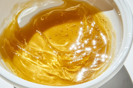 Close-up of a bowl filled with thick, glossy golden honey, capturing its smooth texture and natural richness.