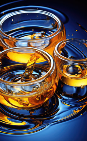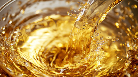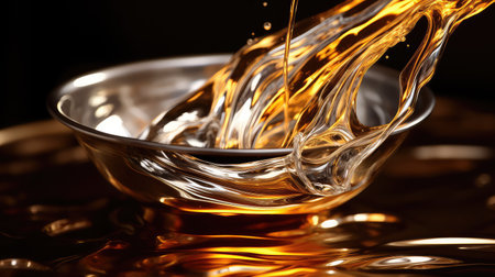 Golden liquid pours elegantly into a clear bowl, set against a black background, conveys opulence. Ideal for high end beverage ads. High quality photo