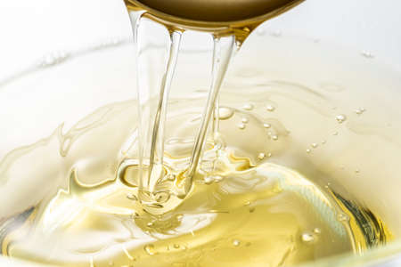 A close-up view of golden liquid gracefully pouring from a spoon into a large container, showcasing the precision and beauty of industrial manufacturing processes.