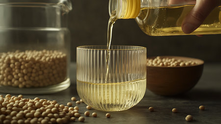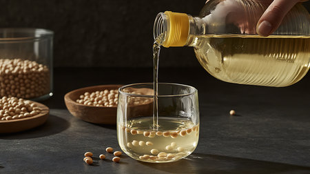 Golden soybean oil is being carefully poured from a bottle into a clear glass filled with soy beans. The dark background accentuates the light golden hue of the oil.