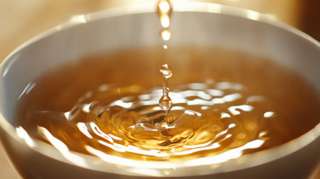A soothing stream of warm tea cascades into a bowl, causing gentle ripples across the surface. The scene is set on a wooden table, evoking a sense of calm.