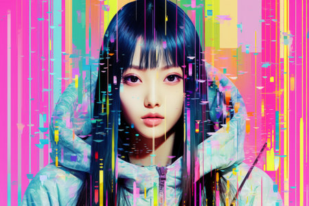 Close up portrait of a young woman featuring double exposure with glitch art elements
