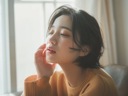 This stunning close-up features a young Asian woman with long, wavy dark hair, gently touching her face. Her soft expression and natural beauty radiate warmth and confidence, inviting viewers to connect with her serene presence.