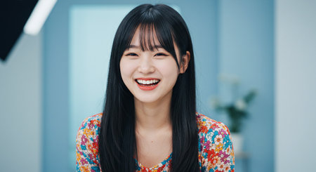 Young Asian woman posing, smiling brightly with flowing hair and colorful ribbons, embodying youth, joy, and movement
