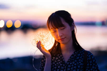 Portrait of beautiful young Asian woman breathing air with eyes closed.