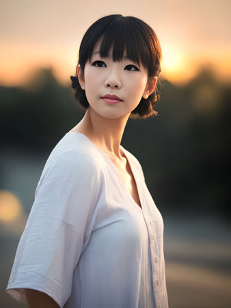 A young Asian woman with short hair looks thoughtfully towards the horizon during a serene sunset, capturing a moment of reflection and peace.