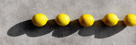 Bright yellow lemons arranged in a line create distinct shadows on a soft concrete background, highlighting their vibrant color and texture.