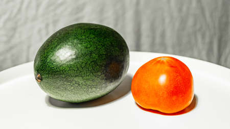 Small, fresh, dark green watermelon of the Dragons Egg variety and a red tomato on a white-grey background