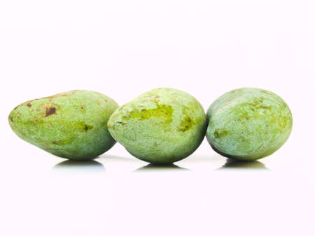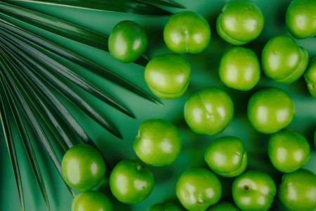 Cherry plum fruits on a yellow background. Healthy green fruit. Southern fruit isolate. Tkemali