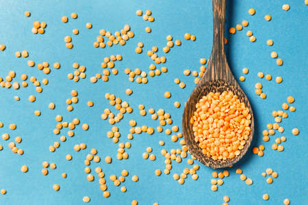 Red lentils in a wooden spoon on a blue background. Healthy food concept. Copy space