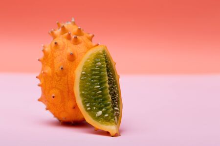 One orange Kiwano and half Kinavo on a pink and orange background..Eating exotic fruits. Horned melon.