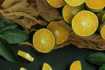 Close-up ,The Orange fruit on purple backdrop.The fruit have many vitamin C. Macro photo fresh orange