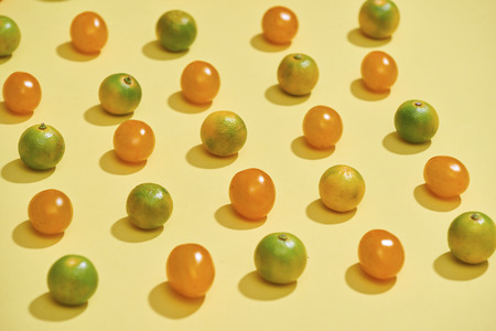 Seamless pattern with tomatoes and Calamondin or citrus microcarpa. Abstract background. Tomato on the yellow background