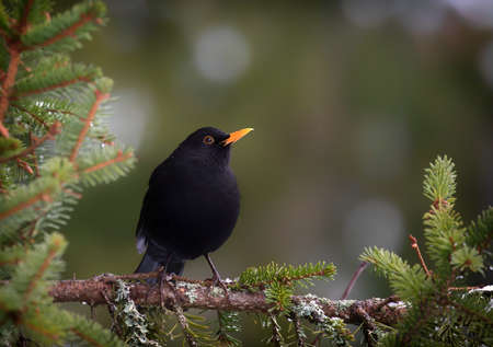 Portrait of male blackbird in winter season. Wildlife scenes in natural habitat.