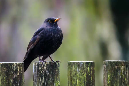 Selective focus photo. Common blackbird, Turdus merula sitting on fence in garden.
