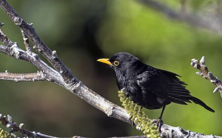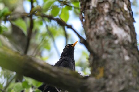 blackbird or Turdus merula in spring time shot in a tree. Male blackbird is sitting in a tree.