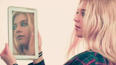 Young teenage woman using tablet surfing on internet, working or getting inspirations.