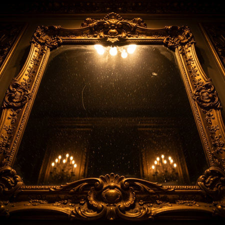A dramatic, low-angle, cinematic photograph of a massive, ornate gilded mirror centered in the frame