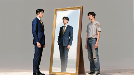 A young man sits in front of a mirror. gazing at his reflection. The image evokes contemplation. introspection. and the search for self identity.