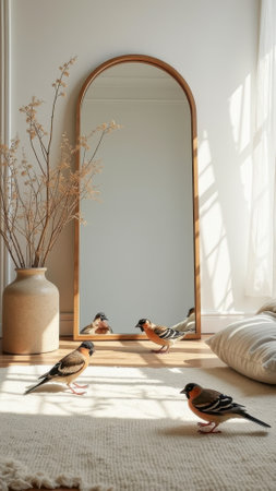 Charming scene with birds by mirror and warm natural decor in sunlit room. That the image is generated using AI.