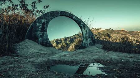 A circular mirror frame sits on a dirt mound, reflecting a hillside landscape under a muted sky. A puddle in the foreground adds a second layer of reflection.